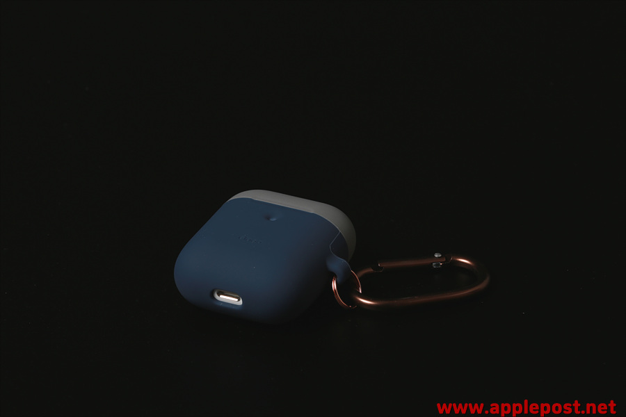 그리고 에어팟2에서 후면 페어링 버튼의 위치도 위로 올라와서 가운데정도로 변경되었는데요 에어팟2 듀오행케이스는 이부분도 수정되어서 가운데 부분으로 페어링버튼부위가 변경되었습니다. 살짝 들어간 부분이 보이시나요?