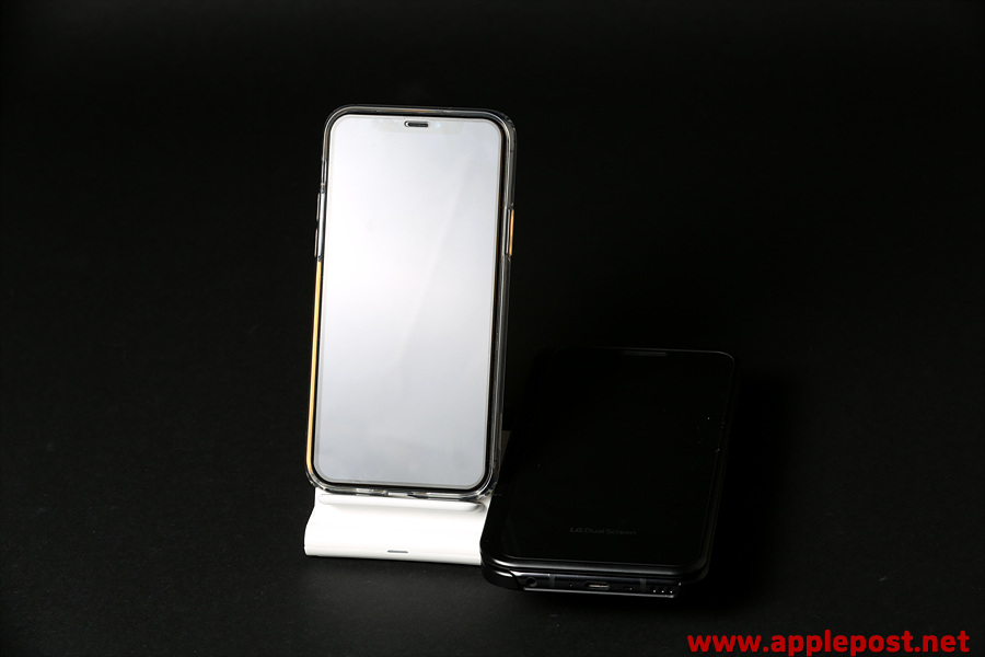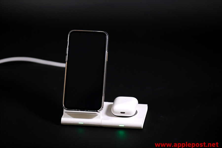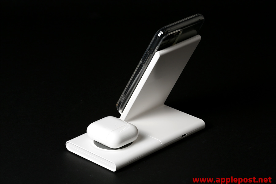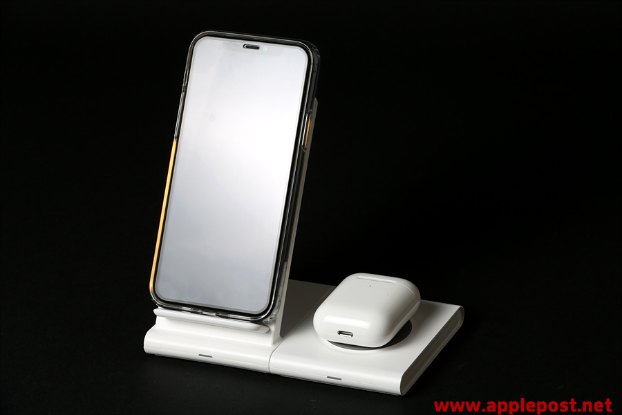스탠드 무선충전기에는 아이폰11프로를 고속무선충전중이고, 우측에는 에어팟2 무선충전모델을 충전하며 사용하는 모습입니다.