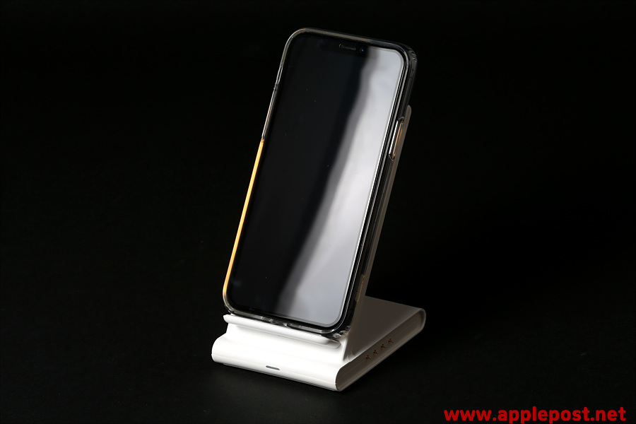 스탠드 무선충전기에는 아이폰11프로를 고속무선충전중이고, 우측에는 에어팟2 무선충전모델을 충전하며 사용하는 모습입니다.