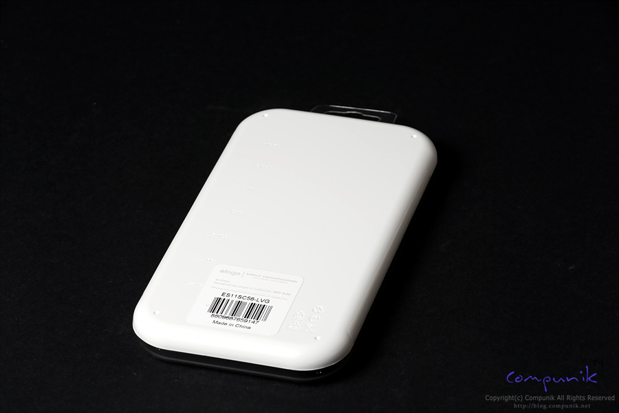 엘라고 케이스의 상징이라고도 할 수 있는 라운드 처리된 투명한 케이스 안에 들어 있습니다.