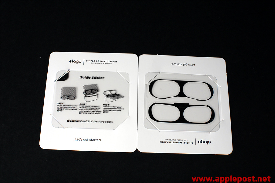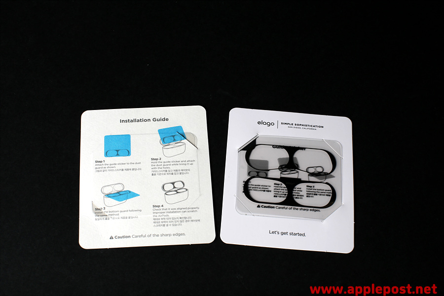 에어팟용 철가루방지스티커때는 없던 가이드 스티커라는게 추가되었습니다. 조금이라도 쉽게 붙일 수 있는 도구가 하나 제공되니까 그래도 좀 더 부착하는데 도움이 되는것 같습니다.
