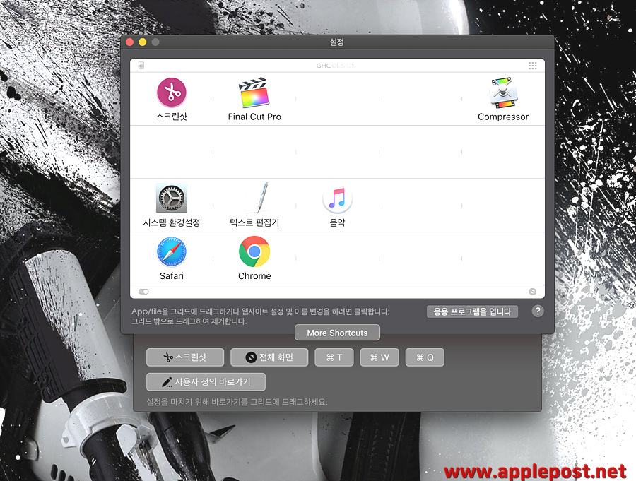 설정창에서 응용프로그램을 열어 바로 끌어와서 등록도 가능하고 스크린샷, 전체화면, 단축키등도 숏컷으로 등록이 가능합니다. 인터넷주소도 직접입력해서 등록도 가능하고 브라우저에서 드래그앤드랍으로 간편하게 등록도 가능합니다.