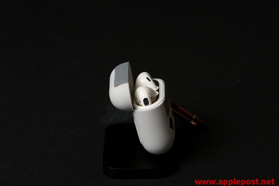 뚜껑을 열면 이렇게 에어팟 이어버드가 나옵니다. 저는 엘라고 철가루 방지스티커와 엘라고 이어팁 스키니 제품을 함께 사용하고 있습니다. 이어팁 스키니는 착용을 한 상태에서도 이렇게 에어팟 케이스에 넣고 충전까지 가능하다는 장점이 있습니다.
