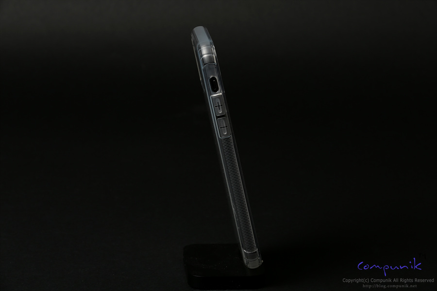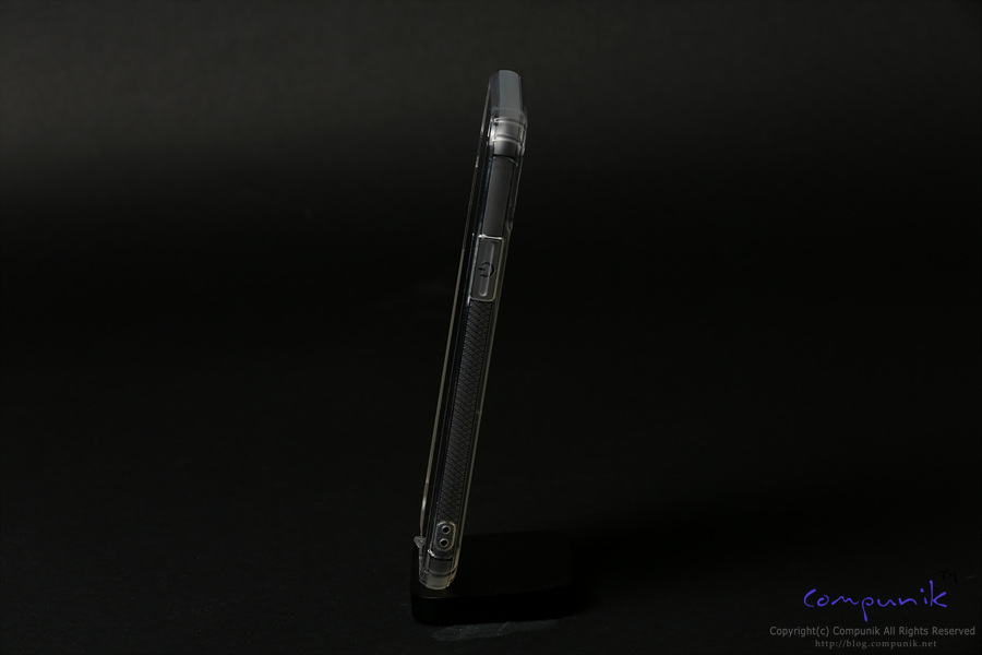 측면 좌측에는 볼륨버튼이 + - 기호로 확실하게 표시하여 손으로 눌러서 감각만으로도 파악해서 누를수 있게 되어있습니다. 좌우측 버튼눌리는 감도 매우 부드러워 케이스를 착용하였어도 불편함 없이 사용이 가능합니다.