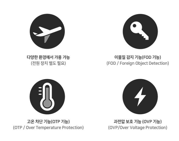 4. 안전기능 : 이물질 감지기능(FOD기능), 고온차단기능(OTP기능), 과전압 보호 기능(OVP 기능)으로 안전한 사용가능