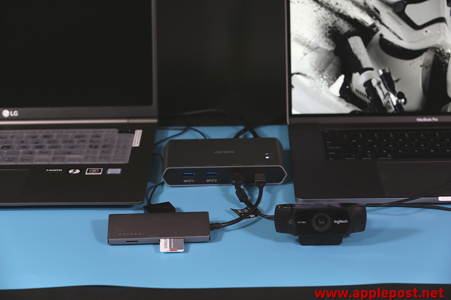 이렇게 연결해 놓고 사용하시면 포트 전환버튼만 눌러서 윈도우 노트북에서 사용하다가 맥북에서 사용하다가 번갈아 사용이 가능합니다. 매번 장치를 분리해서 이쪽 저쪽 왔다갔다 할 필요가 없이 aten us3342에 연결해놓고 서로 공유하면서 사용하시면 쉽고 빠르게 장치 공유가 가능합니다.