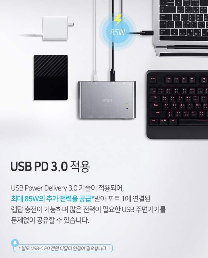 85w usb-c 파워 딜리버리 3.0 패스 쓰루를 지원하여 휴대폰과 랩탑을 동시에 충전할 수 있으며 또한 외장 하드 드라이브 또는 게임기기 와 같이 전력을 많이 필요로 하는 장치도 문제없이 사용할 수 있습니다.
