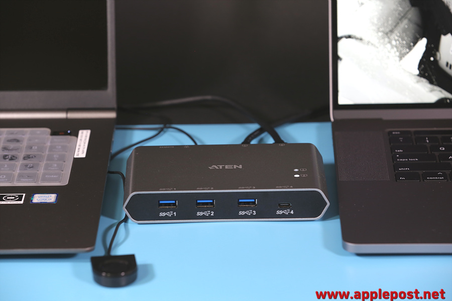 이렇게 연결해 놓고 사용하시면 포트 전환버튼만 눌러서 윈도우 노트북에서 사용하다가 맥북에서 사용하다가 번갈아 사용이 가능합니다. 매번 장치를 분리해서 이쪽 저쪽 왔다갔다 할 필요가 없이 aten us3342에 연결해놓고 서로 공유하면서 사용하시면 쉽고 빠르게 장치 공유가 가능합니다.