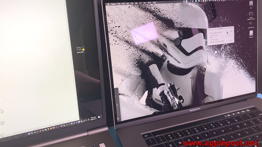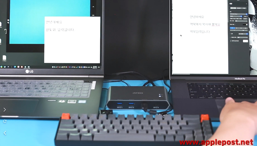 윈도우 노트북과 맥북프로 2대를 연결시킨 모습입니다.