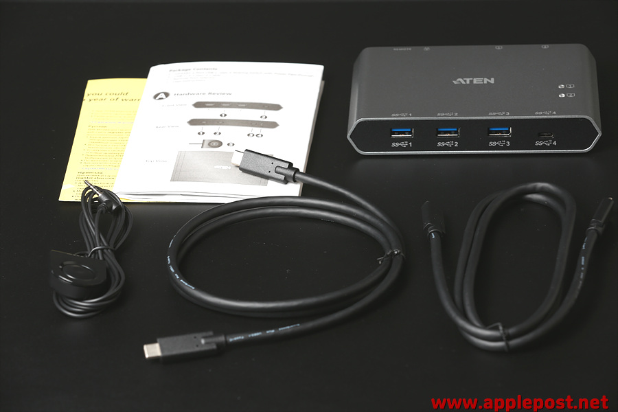 구성품으로는 us3342 제품본체와 사용설명서, usb-c to c 케이블 2개, 원격 포트 선택기가 포함되어 있습니다.