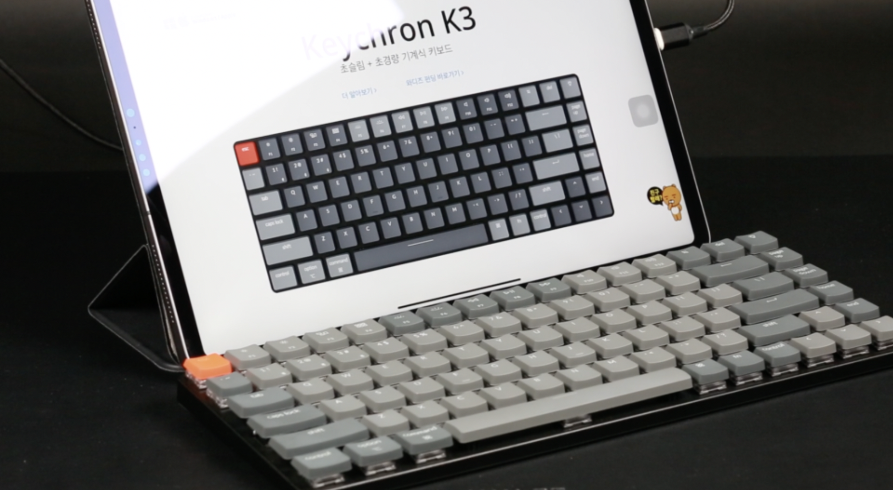 얇고 가벼워서 휴대할수 있는 기계식 키보드로 아이패드 프로 12.9인치와도 잘 어울리는 모습입니다.