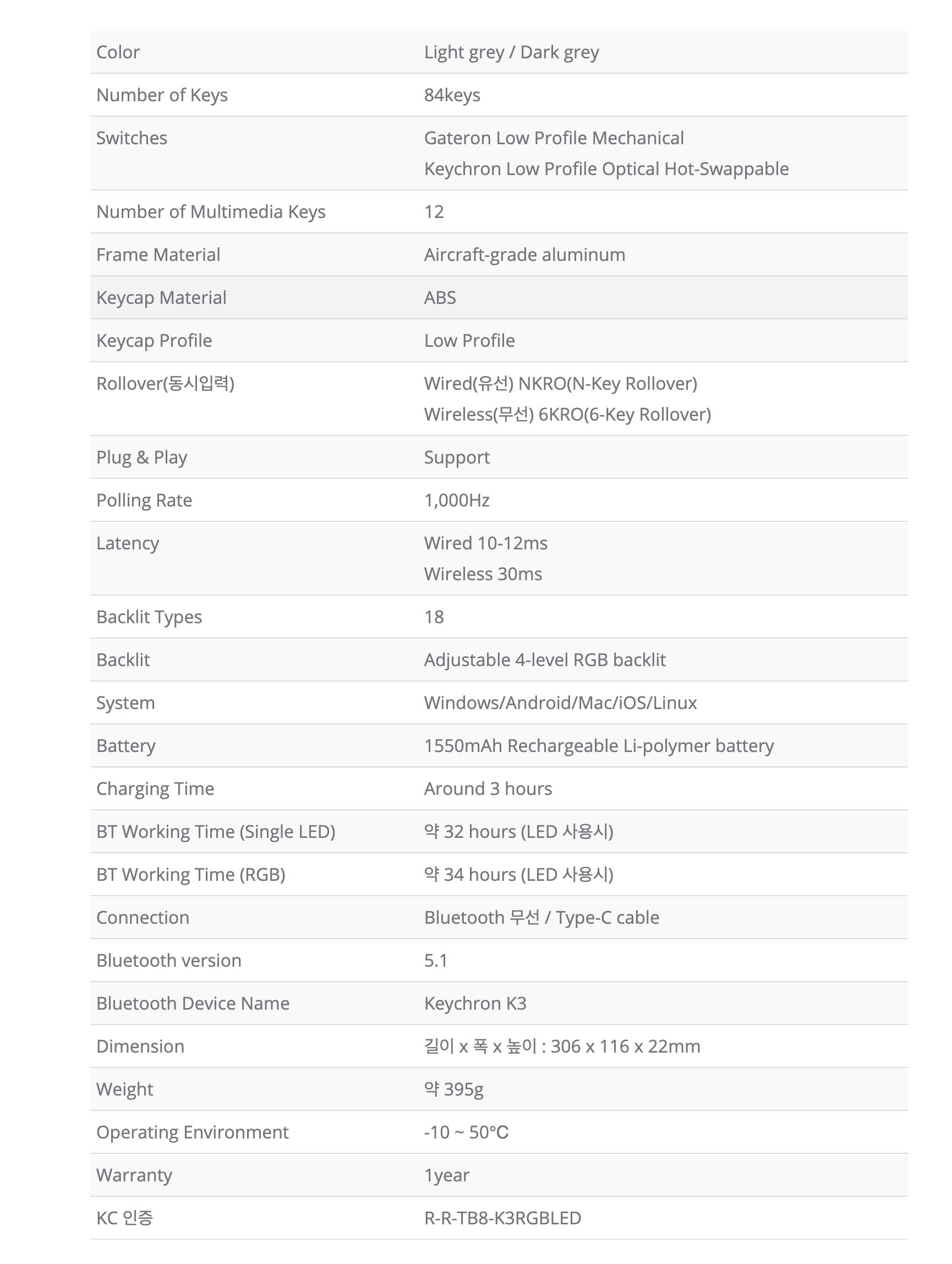 키크론 k3 는 두가지 버전의 백라이트가 있습니다. 화이트 led와 RGB led 가 있습니다. 화이트LED는 15가지 라이팅 이펙트 및 무빙효과를 지원하고 RGB버전은 18가지를 지원하고 있습니다.