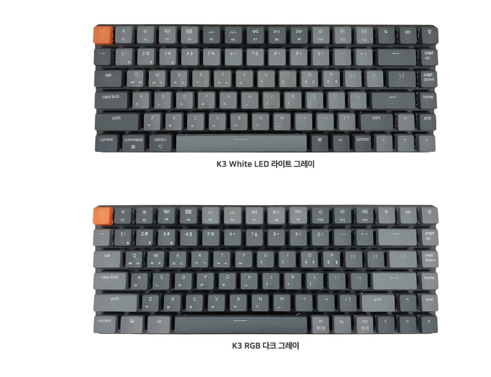 RGB led 는 다크 그레이 컬러 키캡,화이트 led 는 라이트 그레이 컬러 키캡이 제공됩니다.