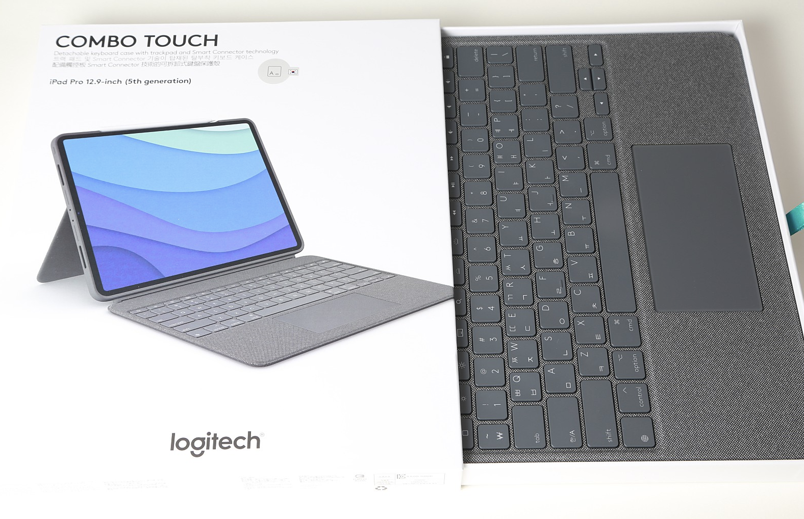 옆면에도 Logitech COMBO TOUCH iPadPro 12.9-inch (5th generation) 으로 제품을 확인할 수 있게 표시되어 있습니다.