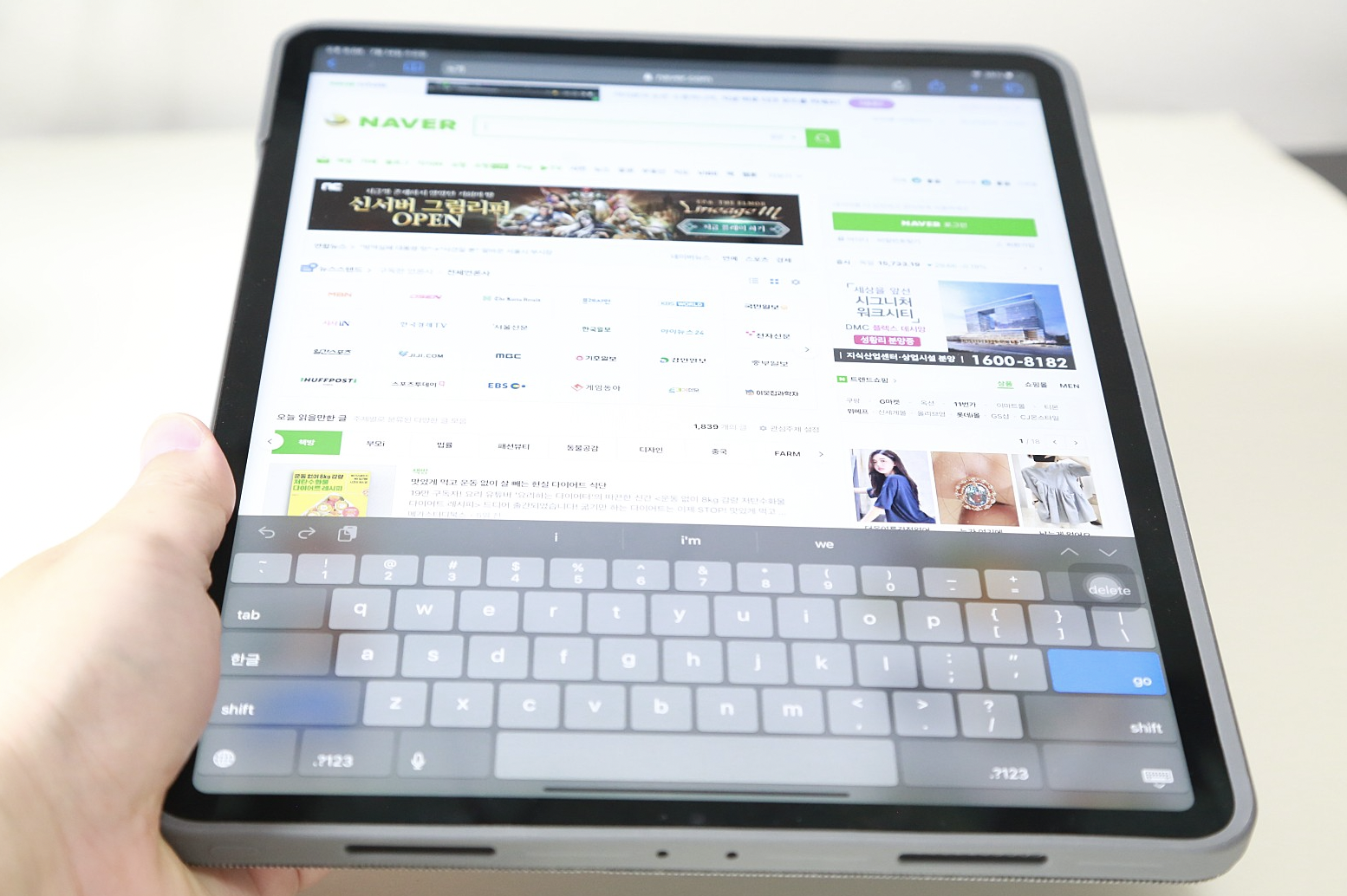 분리형 케이스이기때문에 키보드를 분리시켜 떼어놓고 아이패드만 이렇게 들고 웹서핑이나 책등을 볼 수 있습니다.